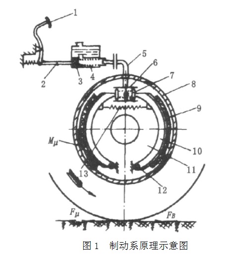 液壓制動(dòng)系的簡(jiǎn)化結(jié)構(gòu)如圖1所示。駕駛員踩下制動(dòng)踏板1,通過(guò)推桿2和主 缸活塞3,使主缸的油液在一定壓力下流入輪缸6,并通過(guò)兩個(gè)輪缸活塞7推使兩制動(dòng)蹄繞支承銷轉(zhuǎn)動(dòng),上端向兩邊分開而以其摩檫片壓緊在制動(dòng)鼓的內(nèi)圓面上,這樣不旋轉(zhuǎn)的制動(dòng)蹄就對(duì)旋轉(zhuǎn)著的制動(dòng)鼓作用一個(gè)摩檫力矩Mμ,制動(dòng)鼓將該力矩傳遞到車輪后,由于車輪與地面之間有附著作用,車輪對(duì)路面作用一個(gè)向前的周緣力Fμ,同時(shí)路面也對(duì)車輪作用著一個(gè)向后的反作用力,即制動(dòng)力FB,制動(dòng)力FB由車輪經(jīng)車橋和懸架傳給車架及車身,迫使整個(gè)汽車產(chǎn)生一定的減速度,制動(dòng)力FB隨制動(dòng)器制動(dòng)力Fμ的增大而增大,但不能超過(guò)車輪與地面之間的附著力。