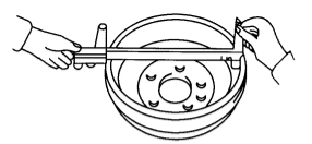 更換新摩擦片時應(yīng)檢查制動鼓的尺寸(測量方法如圖所示),桑塔納2000型轎車制動鼓的標(biāo)準(zhǔn)尺寸為200.00mm,磨損極限為201.00mm。摩擦表面的徑向跳動不大于0.05mm,車輪端面的跳動不大于0.20mm。如果超標(biāo),必須更換新制動鼓。