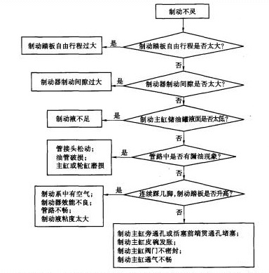 具體參照如圖 所示的液壓制動(dòng)系制動(dòng)不靈常見故障原因的診斷流程進(jìn)行診斷。